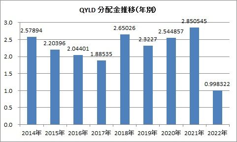 QYLDの2022年累計分配金は0.998322ドルとなり、前年実績比で35%の進捗率となっています。こりゃ、年間ではかなりの減配となりそうです。