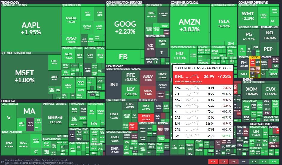 この日、S&P500は前日比2%高となっていて、ヒートマップは全体的に緑色に彩られています。ですが、クラフト・ハインツの赤色が目立っています。
