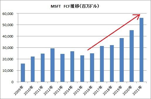 それはキャッシュフローを見たらわかります。マイクロソフトのキャッシュフローは安定的どころか、素晴らしい成長を続けていますよね。