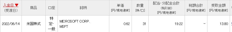 米マイクロソフト(MSFT)から6月分の四半期配当を受け取りました。その額、実に少額(笑)。たったの13.80ドル!