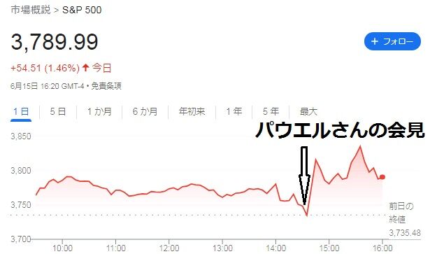 FRBパウエル議長の会見のタイミングで株価が急反発しているのが分かりますね。てか、こんなタイムリーに反応するんやね。