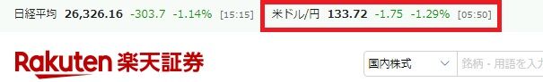 何で?と思って、画面上部を見たら、米ドル/円が133.72円と、1.75円も円高になっていましたね。