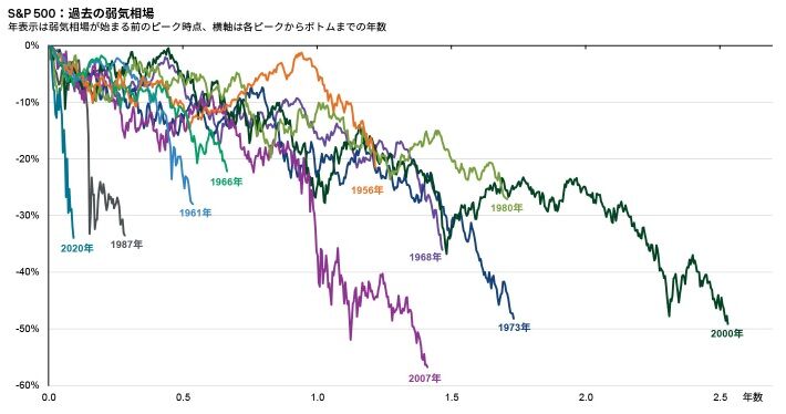 これを見ると、最長では2000年に始まった弱気相場は2.5年強続いたようですし、最短は2020年の弱気相場です。