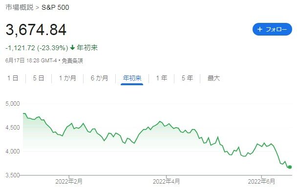 ご存知のように、主要株価指数であるS&P500は年初来で(ほぼ直近高値から)20%以上下落しており、いわゆる弱気相場入りをしています。これは2020年の2-3月にかけて暴落した時以来のこと。
