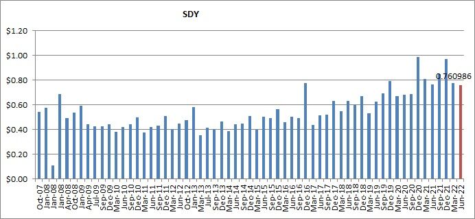 SDYが減配とはいえ、わずかな水準に留まっているので、あまり心配はしていていません。上のグラフのように、四半期分配金は長期的には増加傾向だと分かりますね。