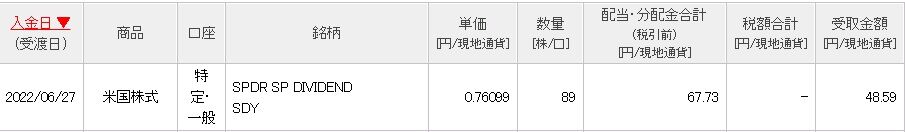 SPDR S&P米国高配当株式ETF(SDY)からです。単価は0.760896ドル、保有数量は89株、税引き後で48.59ドルでした。ありがとうございます!!