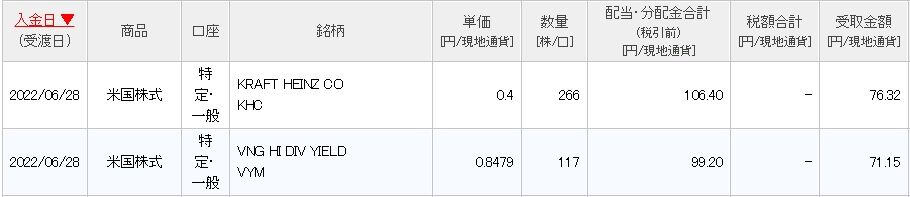 米加工食品のクラフト・ハインツ(KHC)から76.32ドル、バンガード高配当株式ETF(VYM)から71.15ドルです。合計147.47ドルですね。円安ですから、147ドルでも2万円近いになりますv( ̄∇ ̄)v