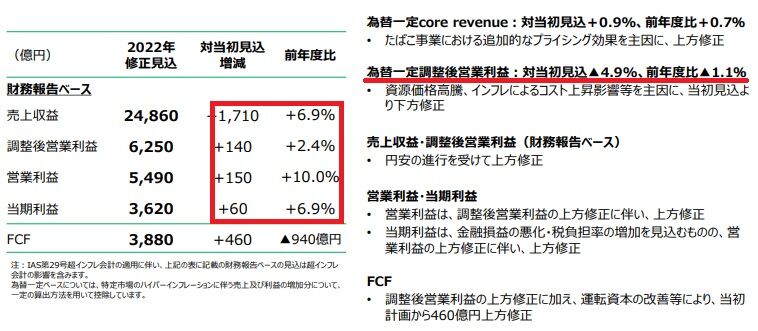 ただし、為替一定ベースの調整後営業利益は、当初見込みより4.9%減少、前年比でも1.1%減少と下方修正させています。これは資源価格の高騰、インフレによるコスト上昇影響等を反映したものです。