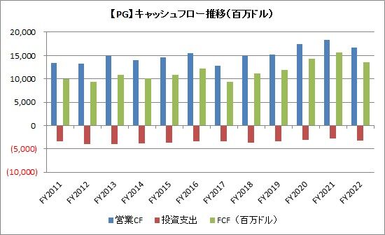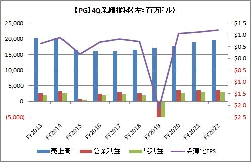 PGの4-6月期(FY2022-4Q)は、増収増益でした。売上高195.1億ドル(3.0%増)、営業利益35.9億ドル(1.6%増)、純利益30.5億ドル(5.0%増)、一株利益1.21ドル(7.1%増)でした。
