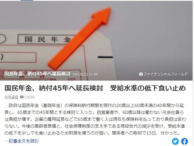 報道によると、政府は国民年金(基礎年金)の保険料納付期間を現行の20歳~59歳の40年間から延長し、~64歳までの45年間とする検討に入った、そうです。