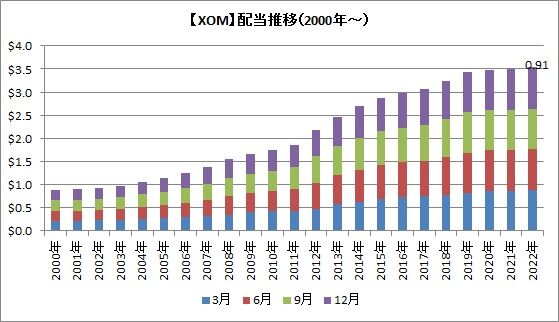 今回、エクソン・モービルは12月からの四半期配当を0.91ドルにすると発表しました。従来は0.88ドルでしたので、3.4%増配です。
