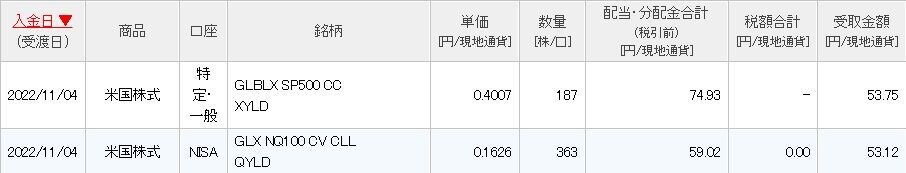 XYLDからは保有株数187株に対して、税引き後53.75ドル、QYLDからは保有株数363株に対して、税引き後53.12ドルです。合計で106.87ドルです。