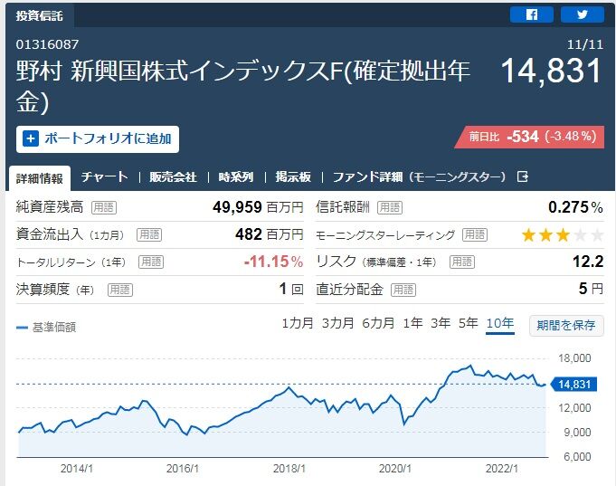 私の会社の商品ラインアップにも、一つだけありました。『野村 新興国株式インデックス(確定拠出年金)』です。