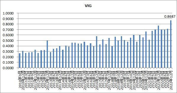 年間合計は2.9725ドルとなりました。前年比11.7%増です。連続増配年を9年に伸ばしました。あと来年増配したら、VIG自身がVIGに組入れられそう(笑)