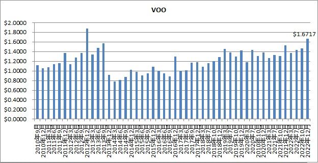 2022年の合計分配金は5.9467ドルとなりました。前年比で9.4%増で、2年連続増配です。