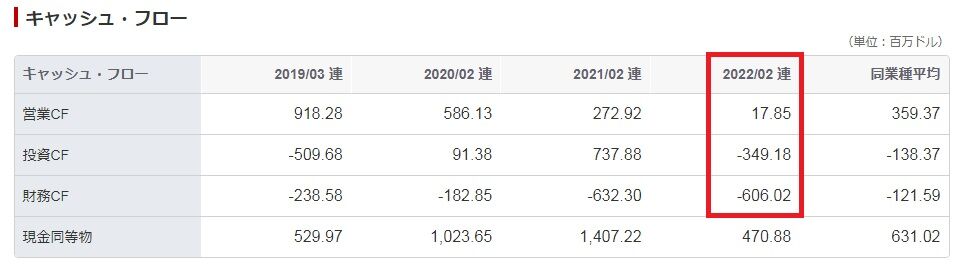 営業キャッシュフローも全然ありません。