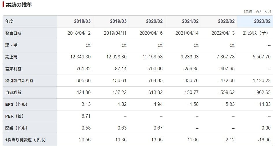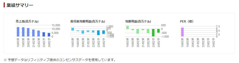 楽天証券の業績サマリーから引用しますが、売上高は右肩下がり、年間損益は19年3月期からずっとマイナス。PERも算出不能。