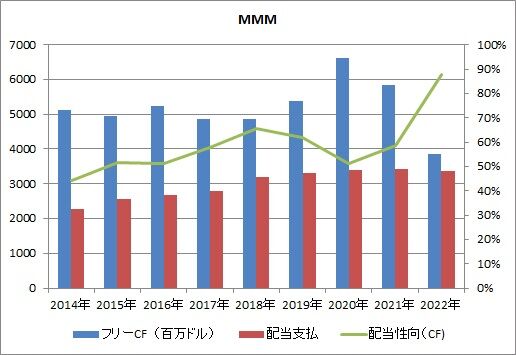 3MのフリーCFは34%減少し、配当性向は29ポイントも上昇しました。