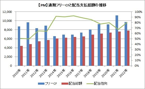 はい。そして、上記3点(営業CF、投資支出、配当支払額)から算出できる、フリーCF(営業-投資支出)と配当性向(配当支払額÷フリーCF)においても同様です。