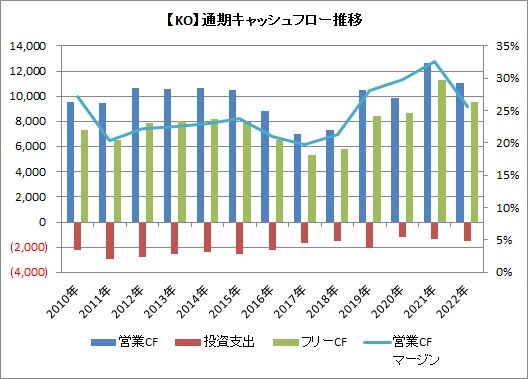 コカ・コーラはフリーCFが15%減少、配当性向は16ポイント上昇しました。