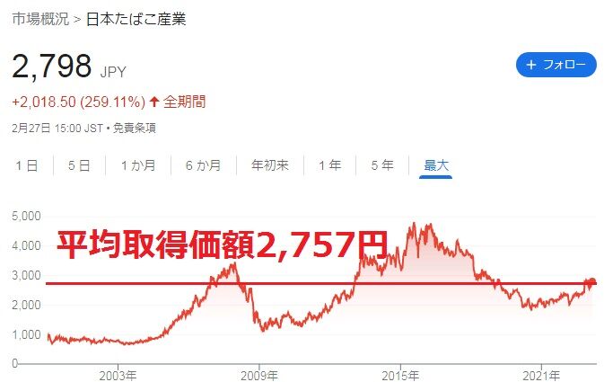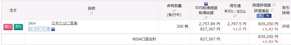 JT株を300株保有しているので、その取得総額は827,367円。