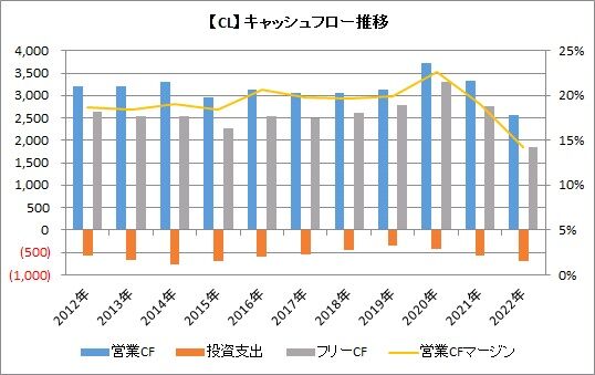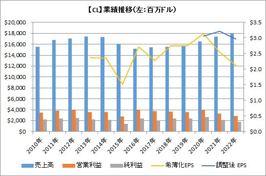 さて、そんなコルゲート・パルモリーブの2022年の業績は、売上高は前年比3%増となったものの、営業利益は同13%減、調整後一株利益は同7%減でした。
