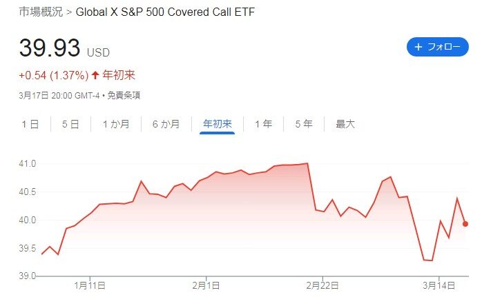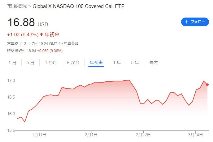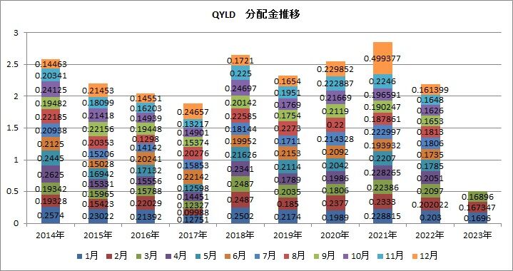 QYLDの株価は年初来では6.43%高となっています。2月分の権利落ちの時に株価が急落したのですが、