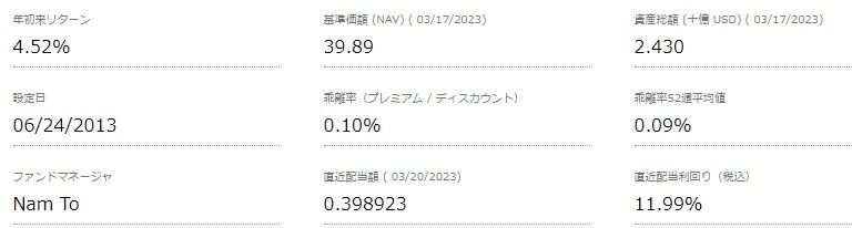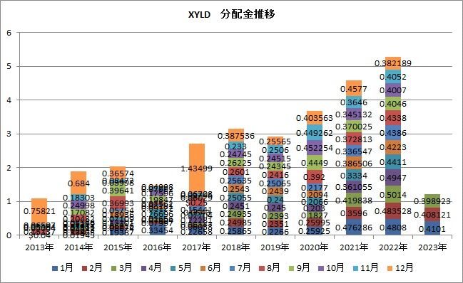 XYLDの3月17日時点での資産総額は2.430十億ドルだそうで、前月比では3.4%増えたんですね。昨年10月以降、6ヶ月連続で増加しているんです。