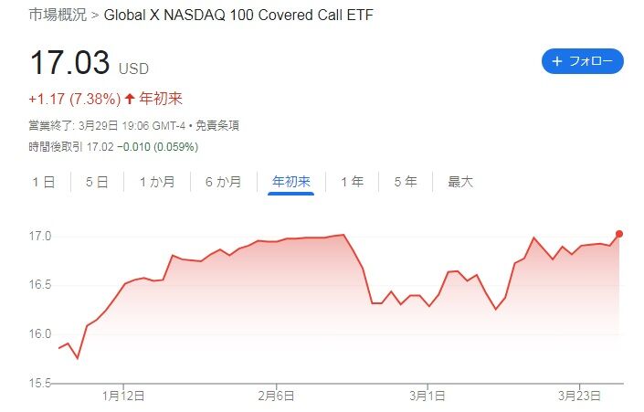 株価が17ドル台を回復している!!年初来では+7.38%ですね。カバードコールなので、QQQみたいな株価上昇は見込めませんが、良しとしましょう。しばらく株高が続いて欲しいですね。