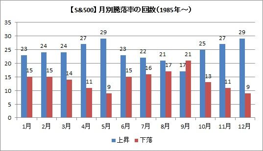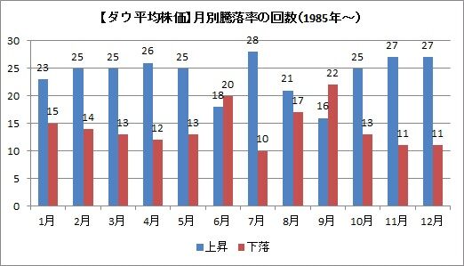 1985年以降のダウ平均株価の月別騰落は、4月に上昇が26回、下落が12回となっています。圧倒的に上回っている、というほどでもないのですが、それでも7割近い確率で株価は上昇します。