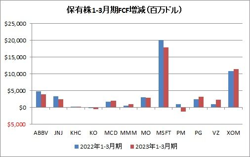 FCFが前年同期比で増加したのは5銘柄(MCD/MMM/PG/VZ/XOM)に留まり、減少したのは7銘柄(ABBV/JNJ/KHC/KO/MO/MSFT/PM)となりました。