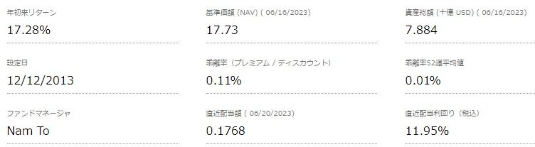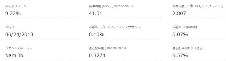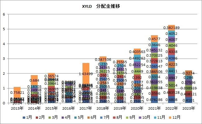 XYLDの資産総額は2.807十億ドルとなっており、前月比3.6%増でした。資産総額の増加は22年10月から続いていますので、この辺りは安心して見ていられます。