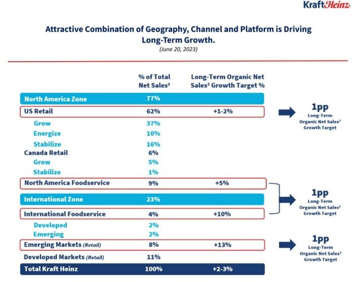 クラフト・ハインツの長期的な純売上高(オーガニック・セールス)の成長目標が書かれていました。特に事業・地域ごとの目標が比較的細かく載っていますね。