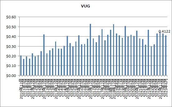 VUGの分配金は0.4122ドルでした。上記2銘柄の半分程度の分配金額ですが、前年同期比では28.6%増、前回比では4.0%減となっています。