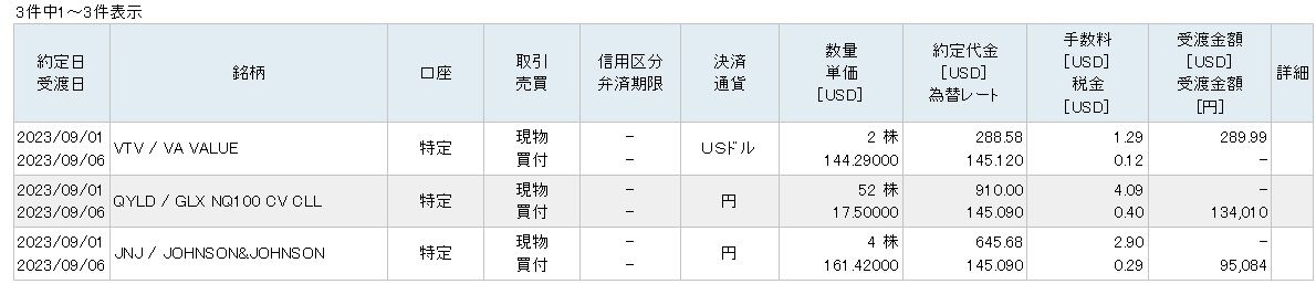 バンガード・バリュー株ETF(VTV)を2銘柄で289.99ドル分、グローバルX・ナスダック100カバード・コールETF(QYLD)を52株で134,010円分、ジョンソン&ジョンソン(JNJ)を4株で95,084円分です。