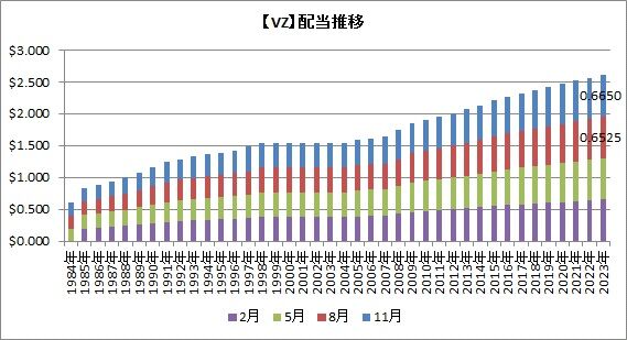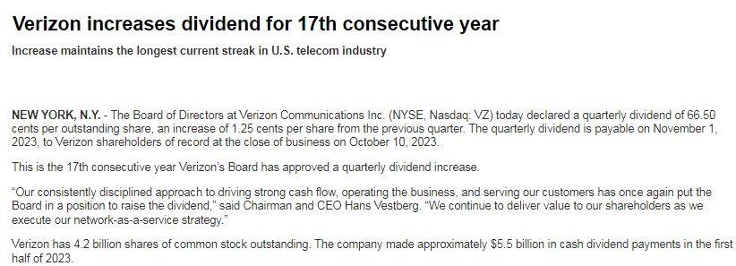 米ベライゾン・コミュニケーションズ(VZ)が11月1日を支払日とする四半期配当を66.50セント(0.6650ドル)とすることを発表しました。