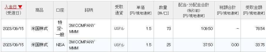 単価は1.50ドル、保有数量は98株(特定口座73株、NISA口座25株)、受取金額は112.29ドル(特定口座78.54ドル、NISA口座33.75ドル)でした。