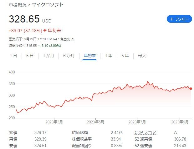マイクロソフトの年初来株価は37%高となっており、S&P500指数の同16%高を大きくアウトパフォームしています。
