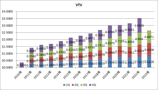 VTVの増配も、9四半期連続です。2012年からの第3四半期だけの増配率(減配も含む)は平均8.2%増なので、3.8%増は低いです。でも、増配は増配です。
