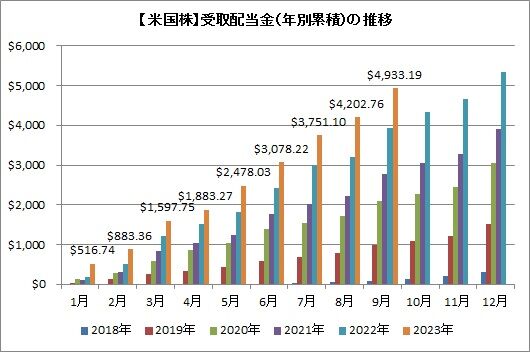 前年同月比で約1,000ドル(25%)増です。22年11月末時点の4675.08ドルをも上回っています。2ヶ月ちょっと早いペースで配当帰宅が積み上がっています。