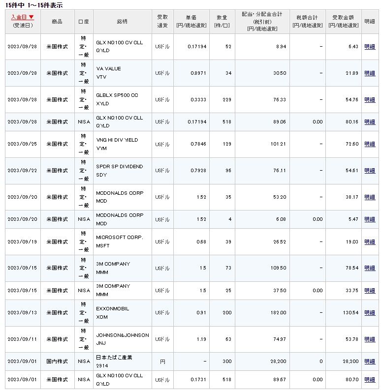 本日、9月分の分配金があるQYLD、XYLD、VTVから、証券口座にそれぞれ着金がありまして、これで全部かと思います。