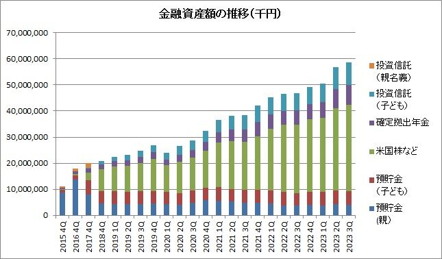 2023年第3四半期末の金融資産はというと、5,857万円でした。これは前四半期末比+3.2です。8-9月は株価が下落しましたが、なんとか資産額としてはプラスで終えました。