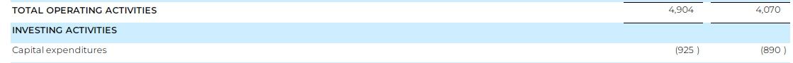 上記の例で言うと、TOTAL OPERATING ACTIVITIESの4,904とCapital expendituresの(925)の差異である4,809がフリーキャッシュフローです。