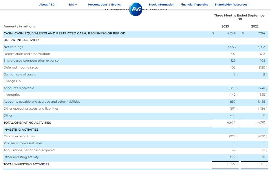 例えば、先日7-9月期の決算発表があったプロクター&ギャンブル(PG)の資料を見てみましょう。こちらはその時のプレスリリースで、連結キャッシュフロー計算書です。