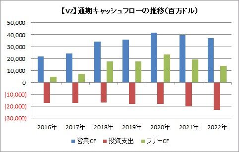 営業キャッシュフローはほとんど伸びてませんが、投資支出が少ないために、フリーキャッシュフローは横ばいで推移できるのです。