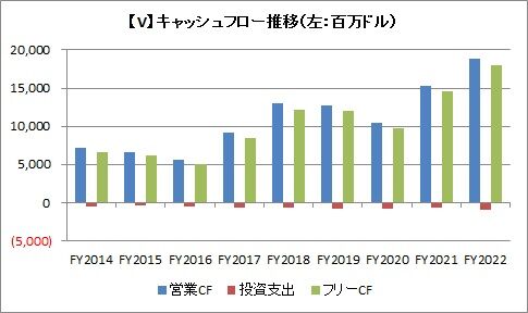 FY2022の営業キャッシュフローは188億ドル、投資支出は9億ドル、フリーキャッシュフローは179億ドルでした。