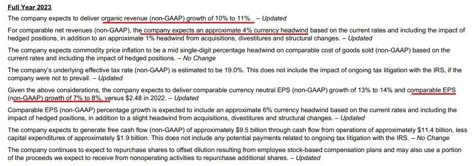 Non-GAAPのオーガニック・セールスは10-11%増に引き上げ(従来は8-9%増)ました。調整後の売上高に対する為替のマイナス効果は4%としました(従来は3-4%)。また調整後一株利益は7-8%増としました(従来は5-6%増)。