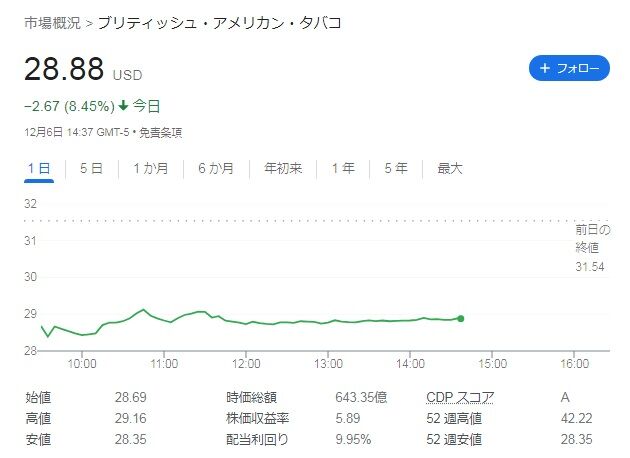ブリティッシュ・アメリカン・タバコ(BTI)の株価が暴落しました。