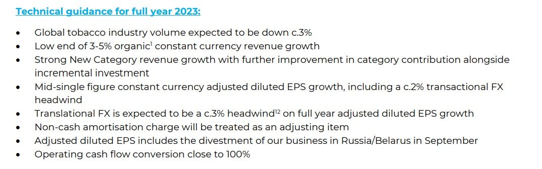 Consistent with our vision to ‘Build a Smokeless World’, and in combination with the current macroeconomic headwinds impacting the U.S. combustibles industry, in 2023 we will take an accounting noncash adjusting impairment charge of around £25bn. This accounting adjustment mainly relates to some of our acquired U.S. combustibles brands, as we now assess their carrying value and useful economic lives over an estimated period of 30 years.上が発表されたガイダンスの一部です。