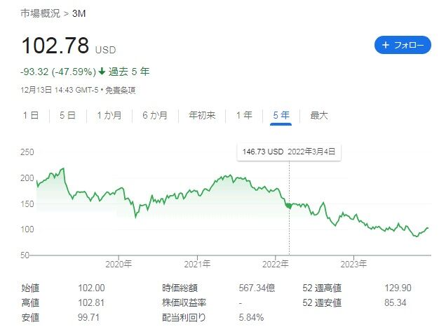 株価は直近5年間で47%も下落。2022年3月時点(146ドル前後)からは約30%も下落しています。